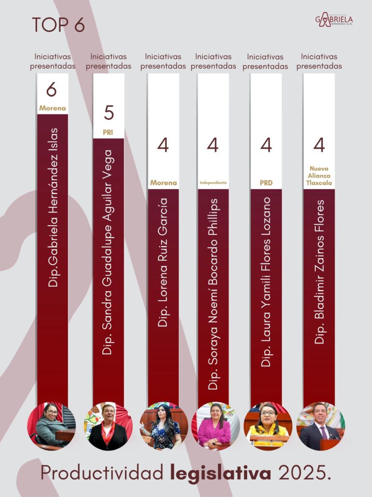 Tlaxcala, Tlax.— La diputada Gabriela Hernández Islas, del grupo parlamentario de MORENA, se posicionó como una de las legisladoras con mayor actividad en el Congreso del Estado al integrar el Top 6 en productividad legislativa 2025, destacando por la presentación de seis iniciativas, actualmente en proceso de análisis y dictaminación en comisiones.