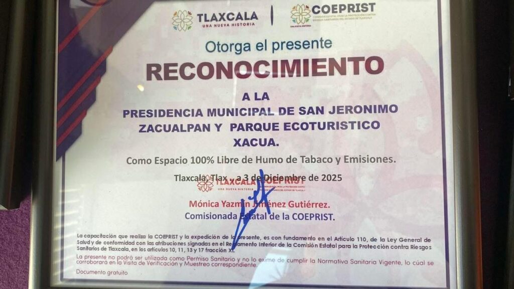 Tlaxcala, Tlax.— El Gobierno Municipal de Zacualpan, encabezado por la presidenta Sandra Corona Padilla, recibió la certificación de la Comisión Estatal para la Protección contra Riesgos Sanitarios de Tlaxcala (COEPRIST), que acredita a la Presidencia Municipal y al Centro Ecoturístico Xacua como espacios 100% libres de humo de tabaco y otras emisiones.